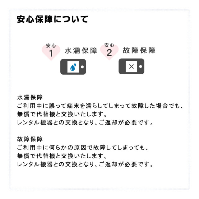 ご利用中に誤って端末を濡らしてしまって故障した場合でも、無償でレンタル機と交換いたします。
