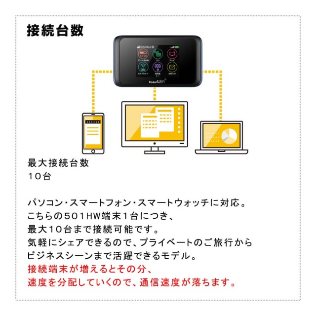 501HWが1台あれば、最大10台の端末と接続できます。